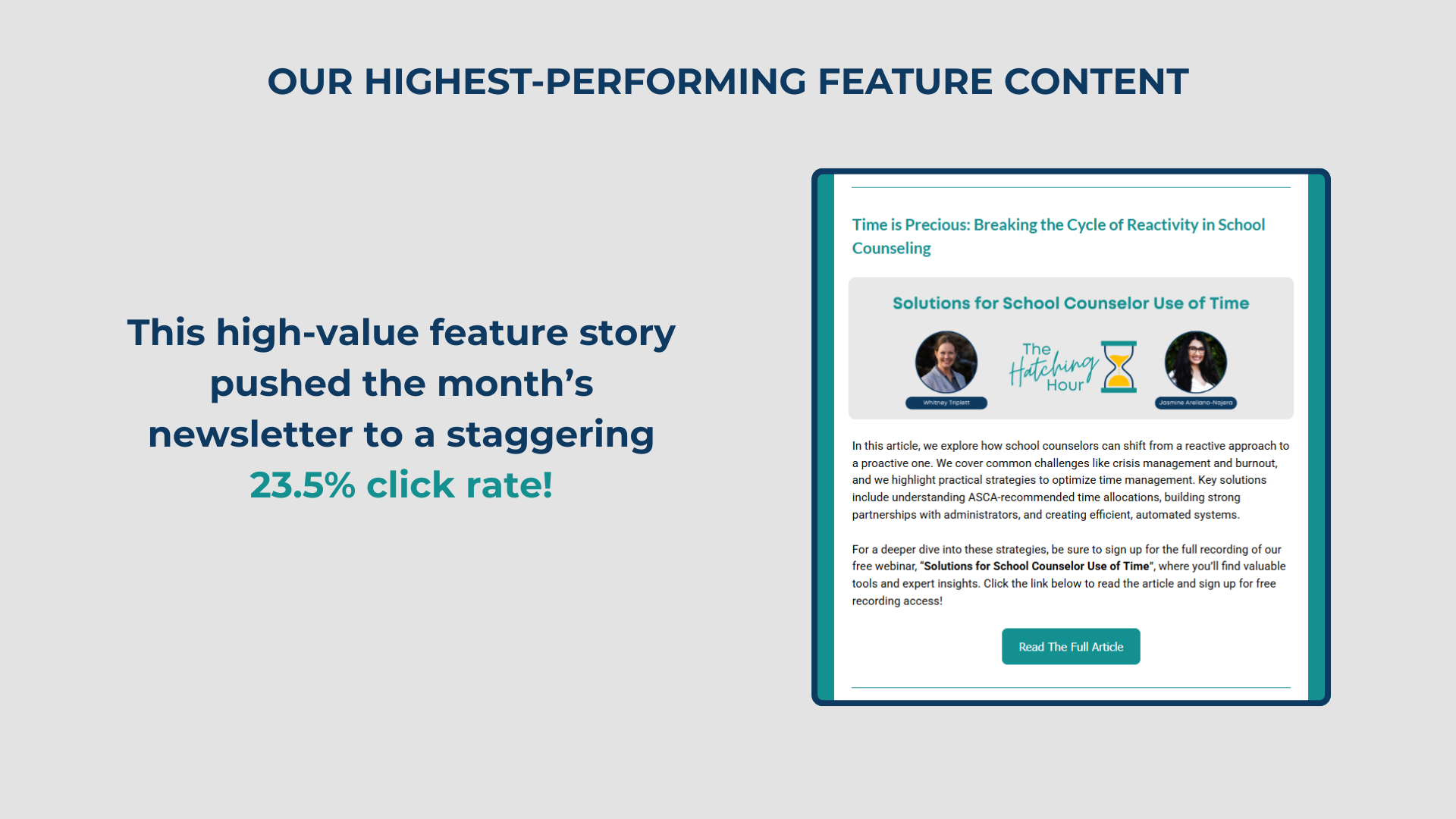 Hatching Results relied on a long-standing quarterly email newsletter to communicate with school counseling professionals. While not their only form of email marketing, it was the primary email communication piece for multiple years. Over time, the newsletter had become bloated with long text-heavy content, and had set a precedent for a basic subject line that seemingly capped its open rate. Key goals were to: